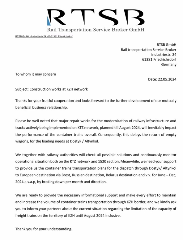 2. 最近哈薩克鐵路網絡維修升級,預計持續(xù)到8月才能緩解。而且因柜量增多,可以循環(huán)使用的車板不夠,換裝以及操作等都會受影響,導致時效延誤。請有需要的業(yè)務注意提醒客戶提前合理做好出貨計劃,結合時效需求選擇匹配的物流運輸方案, 可考慮空運和卡航。